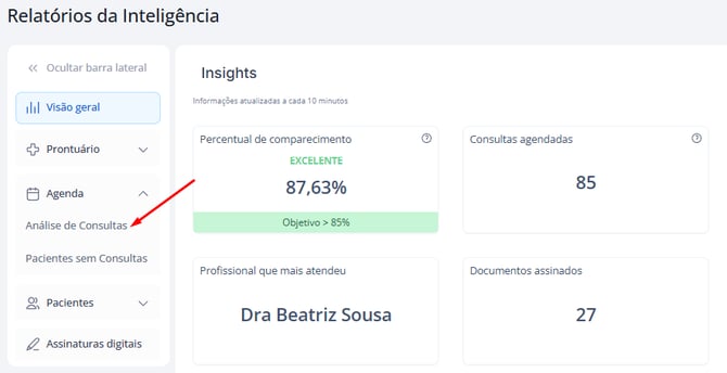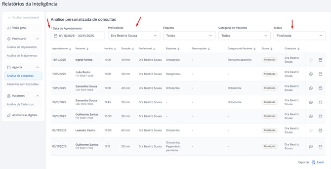 O Relatório de Análise de Consultas oferece filtros que permitem personalizar a análise de acordo com o objetivo da clínica.