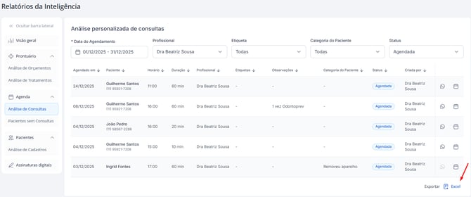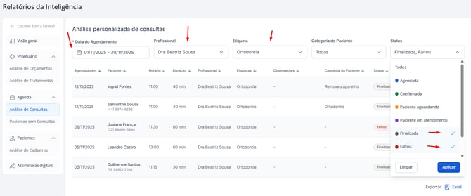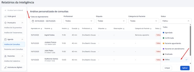 Assim, você obtém uma lista completa de pacientes que não compareceram às consultas naquele período, facilitando ações de contato e recuperação.