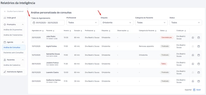 Analisar consultas realizadas por categoria ou etiqueta, como ortodontia, avaliação, retorno, entre outras