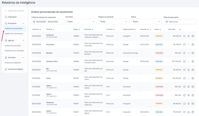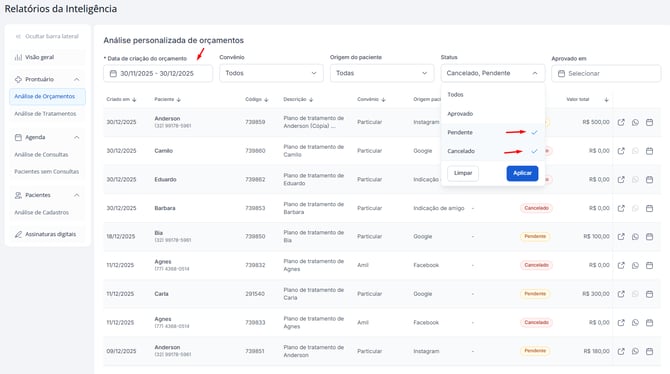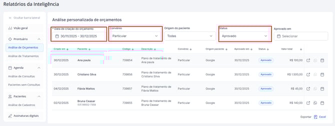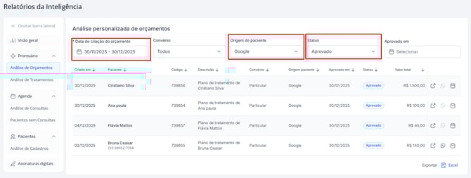 Se quiser acompanhar apenas pacientes de um convênio específicos com orçamentos aprovados, você pode filtrar: Orçamentos criados nos últimos 30 dias + convênio particular + status aprovado.