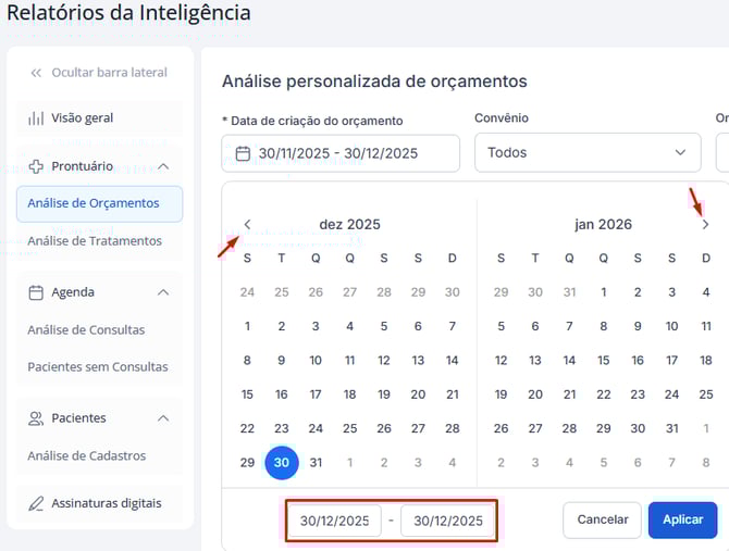 No relatório de Análise de Orçamento, você pode aplicar diferentes filtros para personalizar a análise de acordo com o objetivo da clínica.