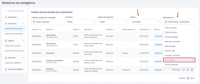 Esse tipo de filtro é útil para acompanhar a quantidade de aprovações em determinado recorte de tempo e entender melhor o desempenho da clínica nesse período. Filtramos no Aprovado em Ano passado + status aprovado.