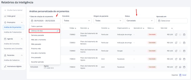 Se a clínica quiser acompanhar quais orçamentos foram cancelados dentro de um intervalo específico, basta aplicar o filtro de período desejado e selecionar o status cancelado. Em nosso exemplo, filtramos por Orçamentos criados nos últimos 30 dias + status cancelado.