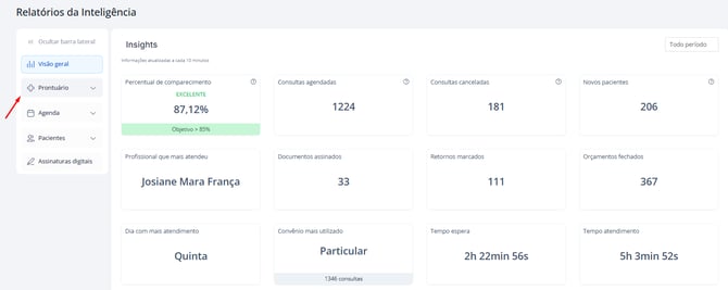 2. Na coluna da esquerda, você verá as categorias de relatórios. Clique em Prontuário para expandir as opções.