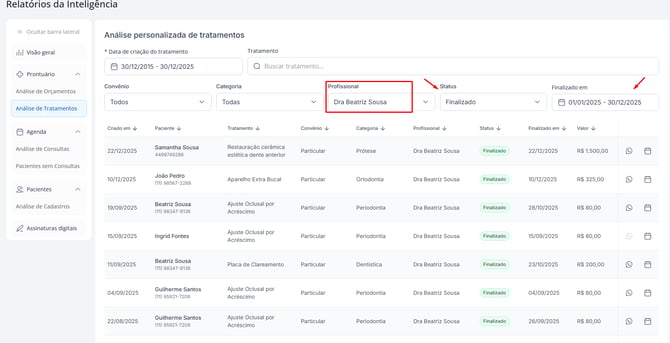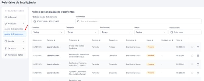 É possível filtrar pela data de criação do tratamento, permitindo analisar os procedimentos lançados em um período específico. Também há filtros por convênio, categoria e profissional, o que ajuda a entender quais tratamentos estão sendo realizados, por quem e para qual perfil de paciente.
