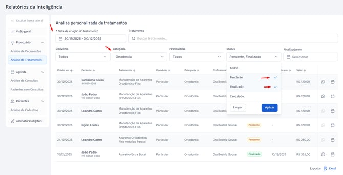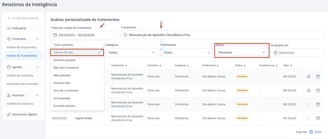 Você também pode visualizar tratamentos combinando múltiplos status para uma análise mais ampla. Por exemplo, pacientes que estão na categoria Ortodontia, nos últimos 30 dias com status — Pendente e Finalizado.