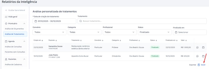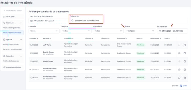 No Relatório de Análise de Tratamentos, você pode aplicar diferentes filtros para personalizar a análise de acordo com o objetivo da clínica.