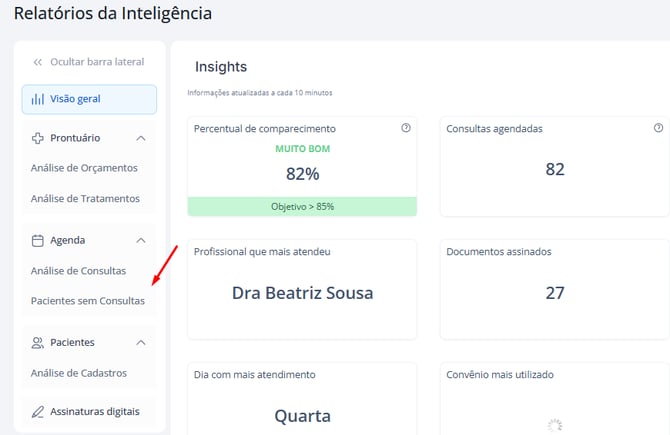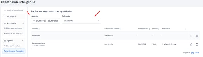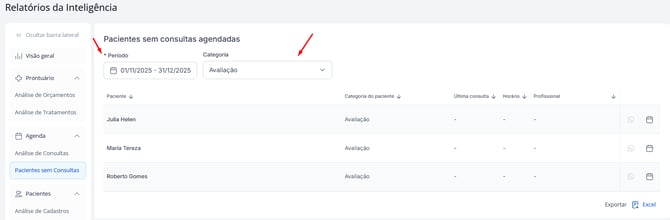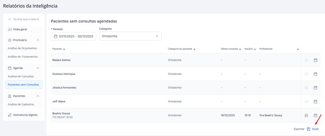 O relatório de pacientes sem consultas foi criado para ajudar a clínica a não perder pacientes por falta de acompanhamento. Com ele, você consegue:
