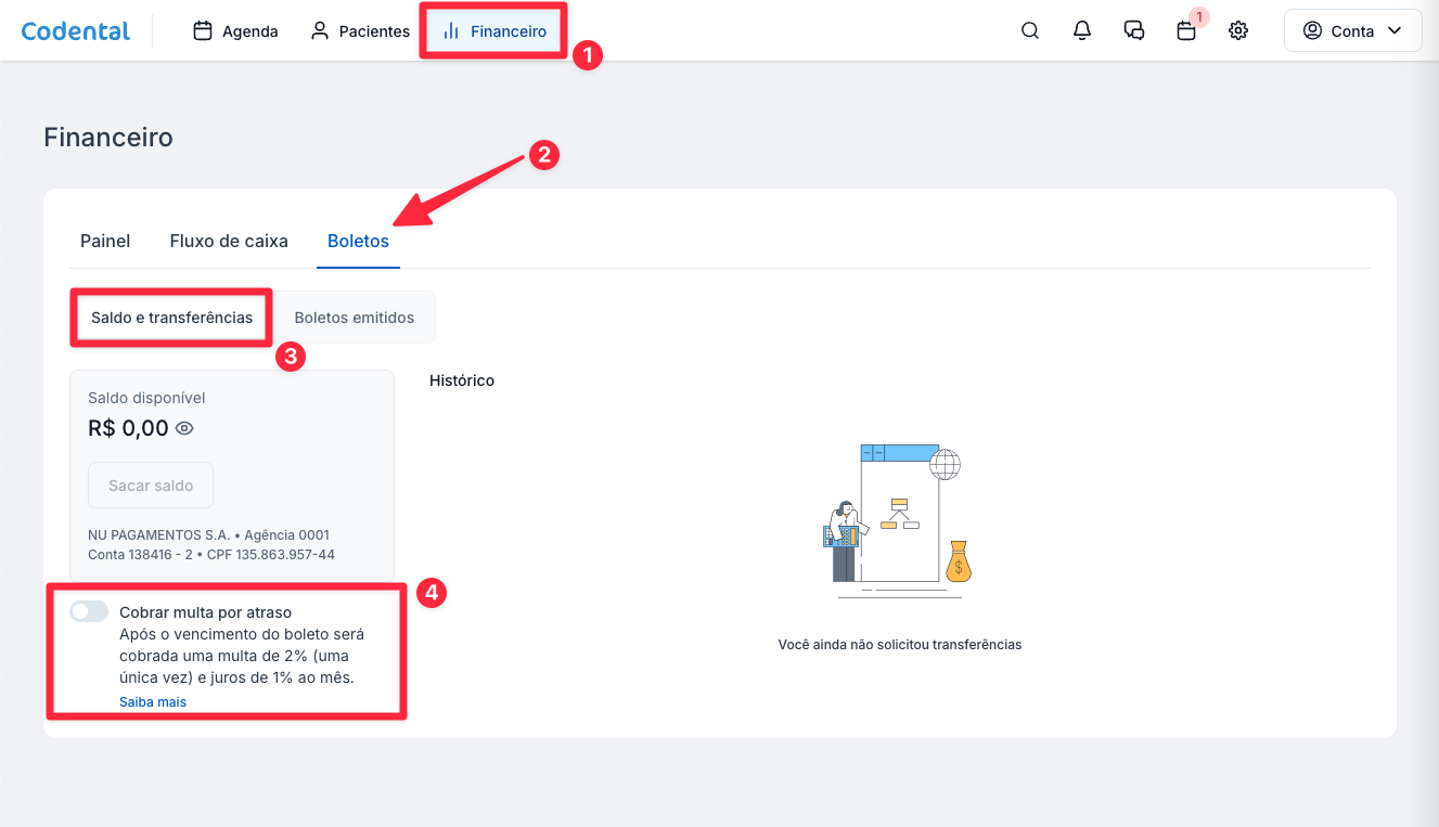 Menu Financeiro > Boletos > Saldo e Transferências.