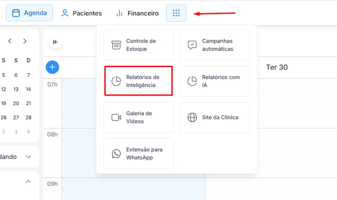Para acessar basta clicar no Ícone de mais ferramentas e depois em Relatórios de Inteligência: