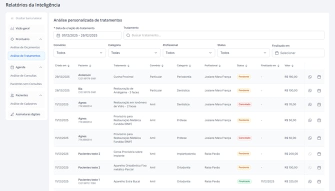 O relatório de Análise de Tratamentos é ideal para acompanhar a execução e o histórico clínico dos pacientes.