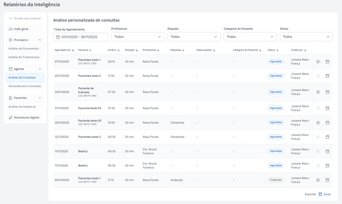 • Identificar pacientes que consultaram em um período específico, filtrando por categoria ou etiqueta (ex.: ortodontia, avaliação, retorno).