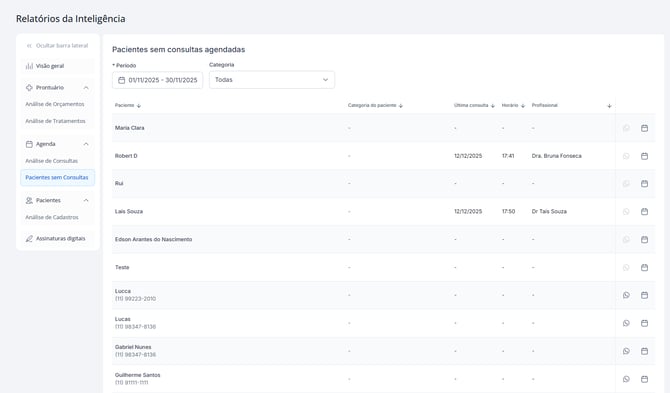 O relatório de Pacientes sem Consultas identifica quem não agendou atendimentos dentro de um período definido.