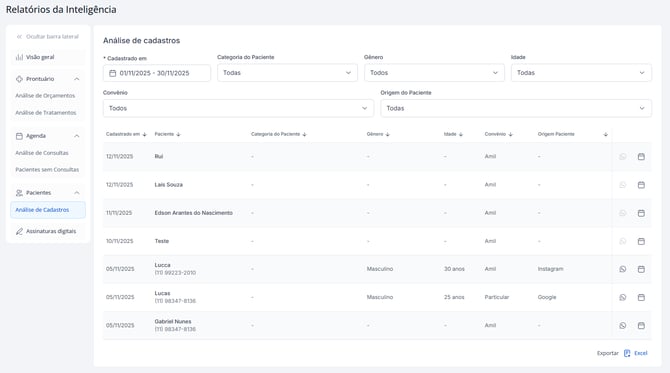 O relatório de Análise de Cadastro permite entender melhor o perfil da base de pacientes da clínica.
