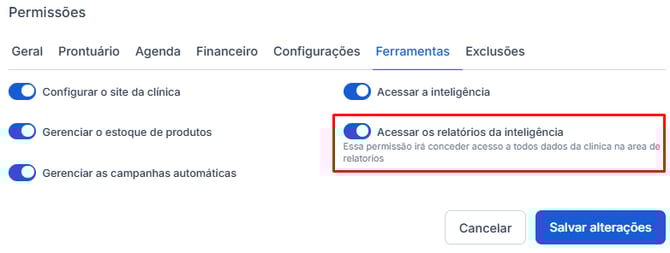 • Ao habilitar essa permissão, o usuário terá acesso a todos os dados da clínica na área de relatórios.